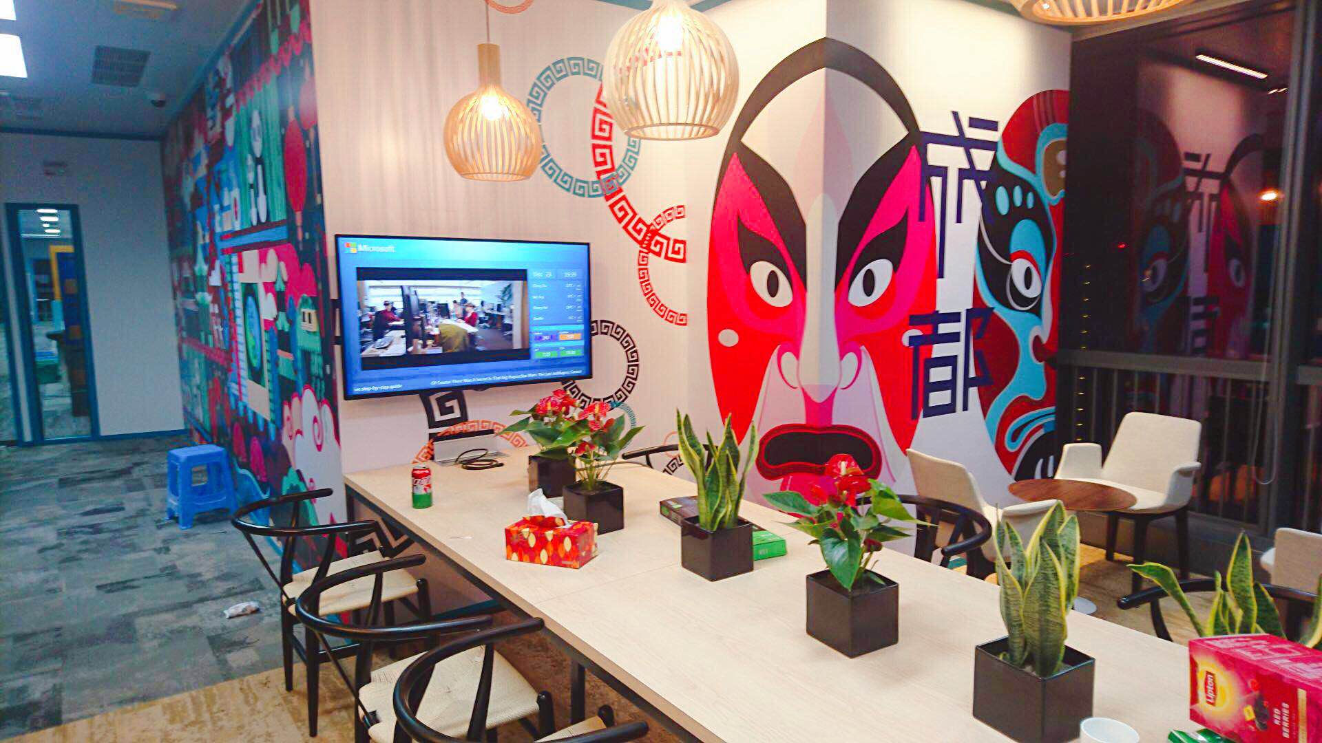 金橋不僅為微軟傾心打造了智能化的高科技會(huì)議室,而且充分結(jié)合當(dāng)?shù)氐娘L(fēng)土人情和元素,打造了輕松休閑的hub space,會(huì)議之余,繼續(xù)頭腦風(fēng)暴。例如微軟成都的臉譜、熊貓、竹子和太極八卦,徹頭徹尾的“成都范兒風(fēng)格”;微軟福州的中國(guó)風(fēng)墻面,現(xiàn)代化與城市特色完美結(jié)合,極大地增加了愉悅高效的會(huì)議體驗(yàn)。