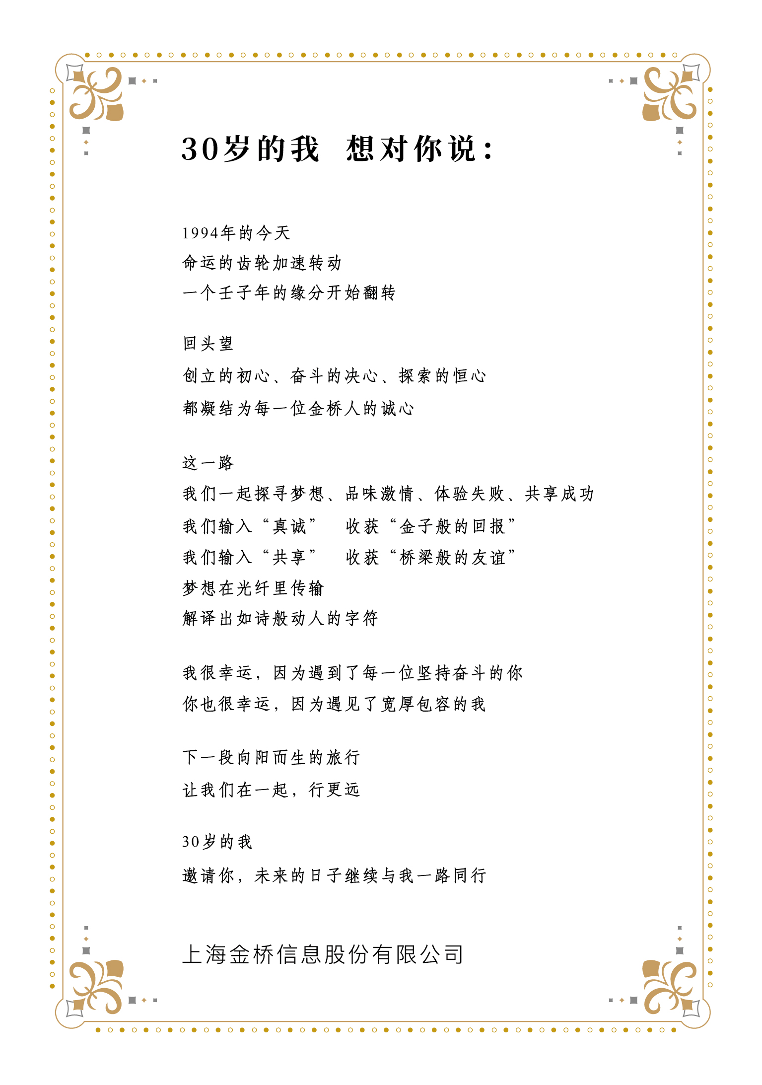 2024年5月16~18日,“在一起,行更遠”金橋信息30周年慶典活動于莫干山開元森泊度假酒店盛大舉行!本次慶典為期三天,除了恢弘盛大的慶典晚宴,還有激情四射的草坪 LIVE SHOW 團建,好吃、好喝、好玩的全部配齊!天南海北的金橋人歡聚一堂,朝著同一個圓心匯聚,點燃生日的蠟燭,舉起歡慶的酒杯,為我們最最深愛的金橋送上生日祝福!而立金橋,生日快樂~~~