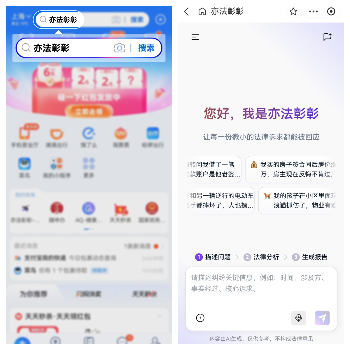 即日起,我們的AI法律咨詢產品“亦法彰彰”正式登陸支付寶平臺啦!
