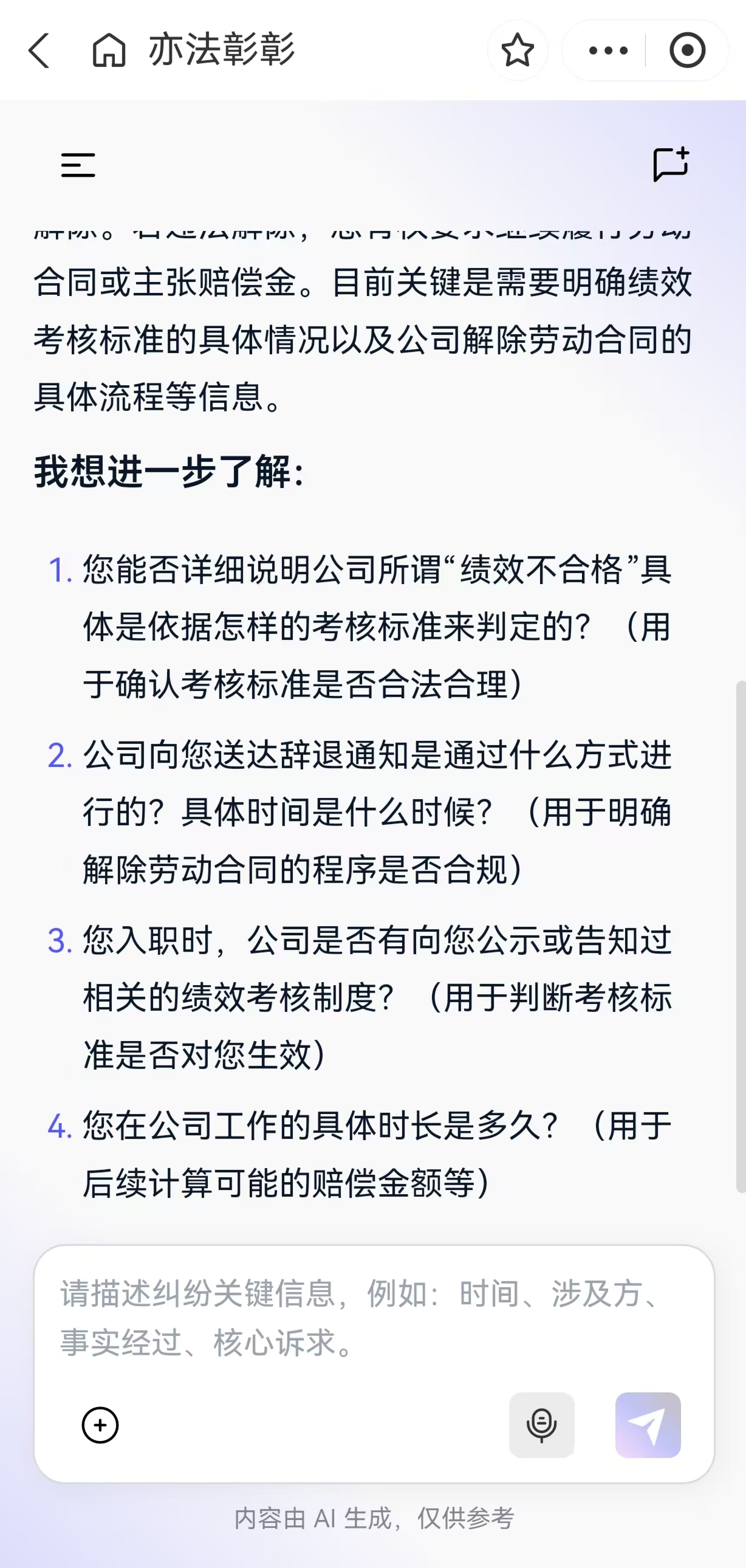 例如,當咨詢勞動糾紛時,它會詢問您的勞動合同簽訂情況、公司辭退流程、加班記錄等細節(jié),就像一位真正的律師在了解案情一樣。